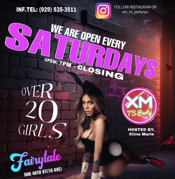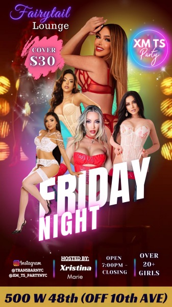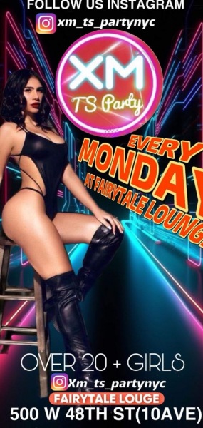We are back 7 DAYS a week!! Trans TS party in NYC every Monday, Tuesday, Wednesdays Thursday Saturday, and Sunday from 7pm-3am. Featuring over 20 TS dancers, lap dance rooms, don't miss out on the hottest transgender party in the city. Enjoy specialty cocktails and music from top DJs all night long. Come join us for an unforgettable evening of fun and entertainment at fairytail Lounge 500 W48th st Follow us on Instagram Xm_TS_PARTYNYC Transbarnyc